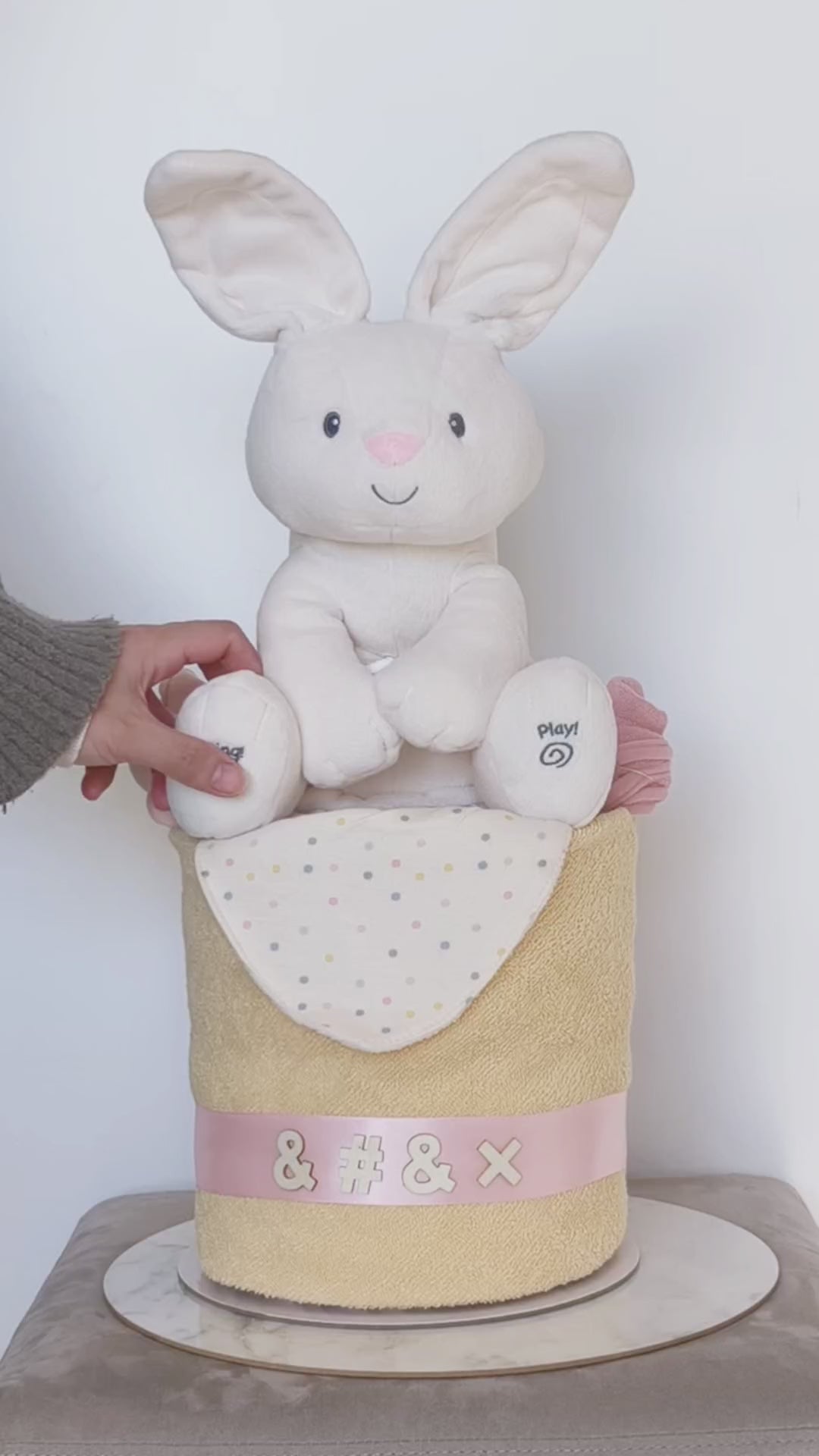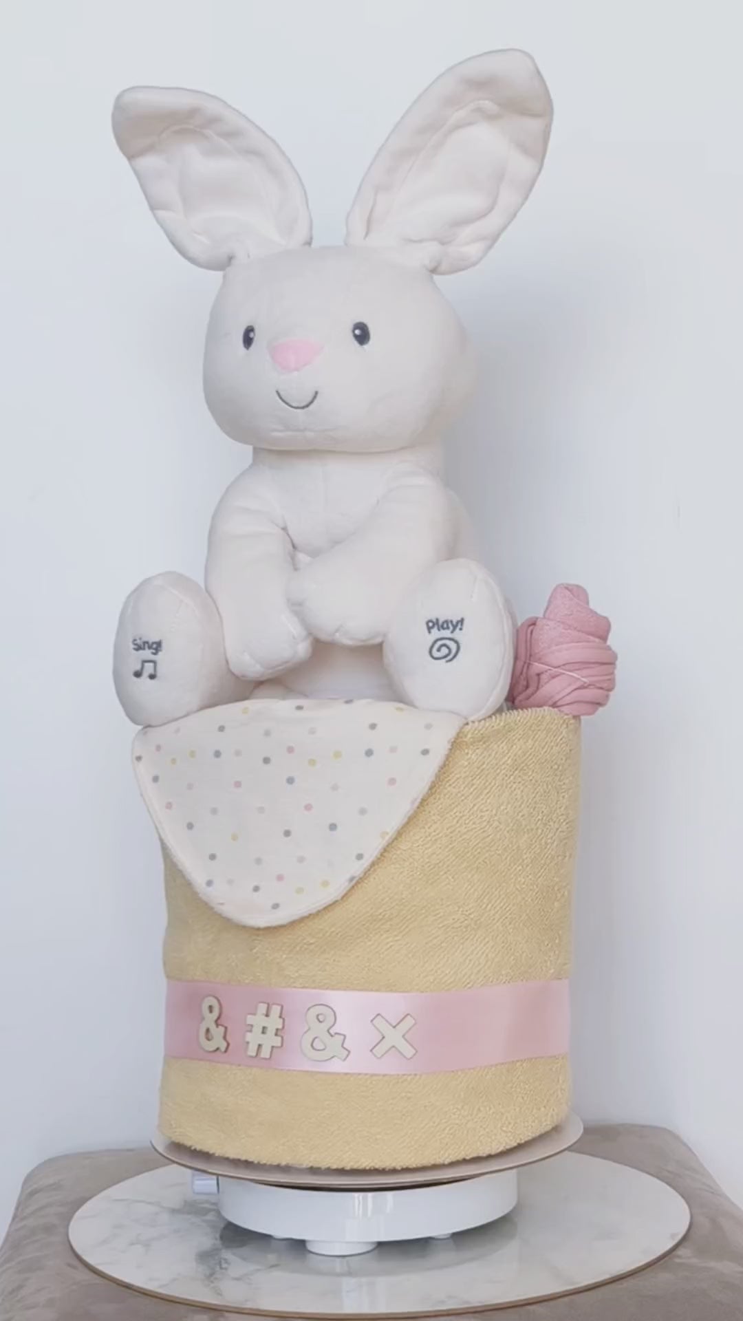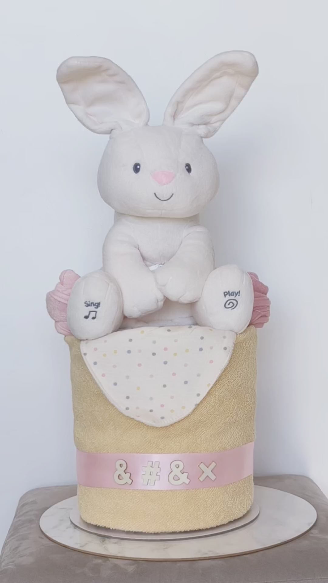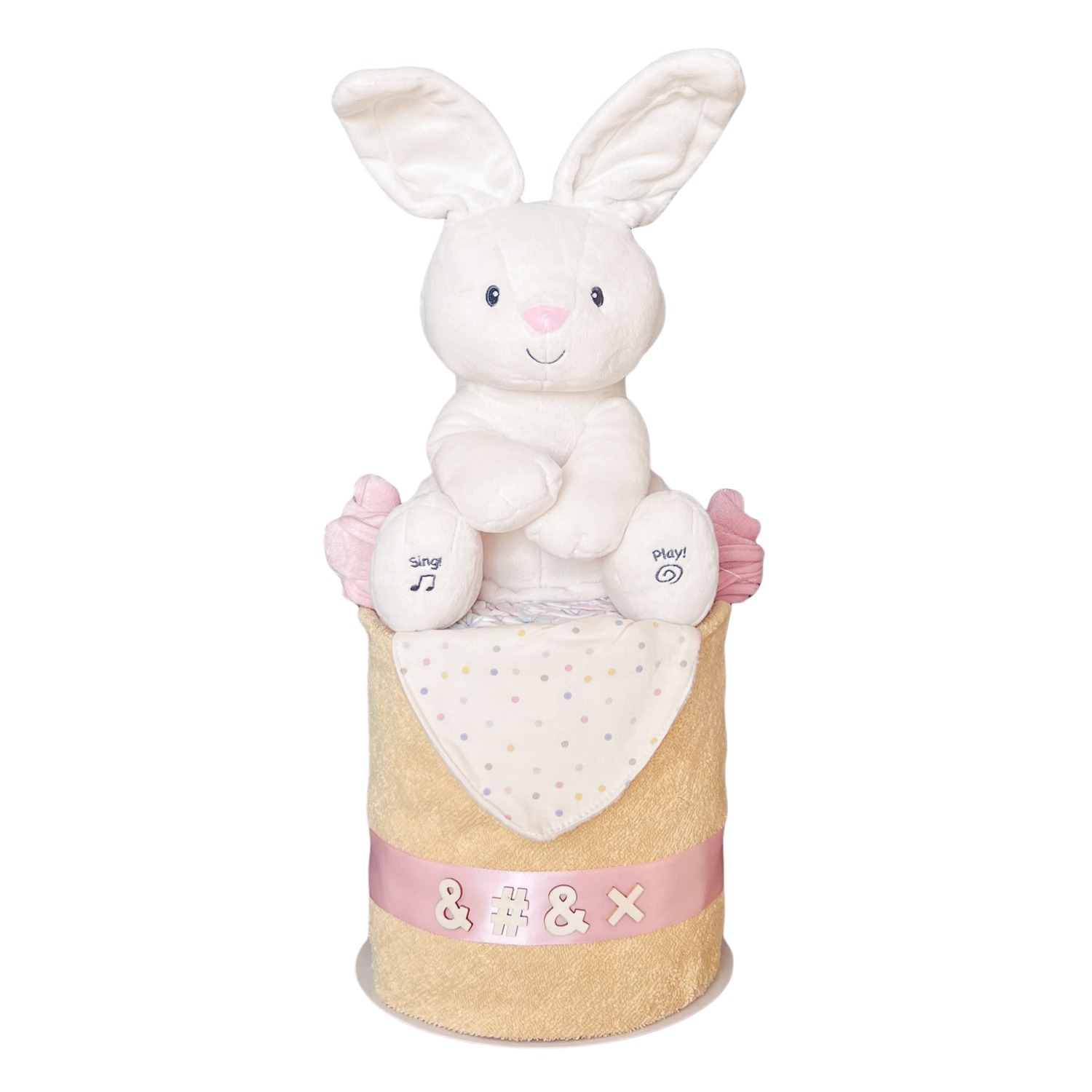 Delight a new family with the Flora Bunny Nappy Cake – a beautifully curated newborn gift that blends softness, charm, and practicality. Featuring an interactive plush toy and essential baby items, this nappy cake can also be personalised with the baby’s name, making it an extra special keepsake for baby showers, hospital visits, or welcoming a precious new arrival.