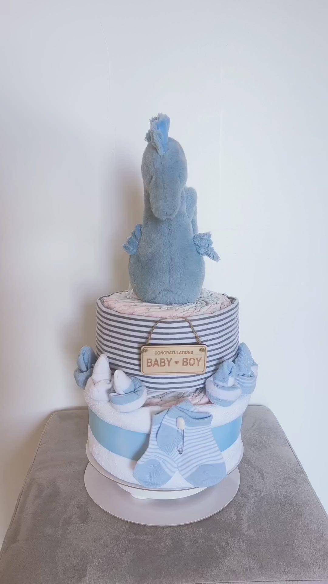 Dive into gifting with Reef the Seahorse Nappy Cake – a stunning, ocean-inspired baby boy gift that blends practicality with coastal charm. Featuring a soft plush seahorse named Reef, this two-tiered nappy cake is crafted with high-quality disposable nappies, baby socks, and a towel wrap, all styled in calming ocean blues and soft neutrals. Finished with a satin ribbon and a wooden “Congratulations Baby Boy” tag, it makes the perfect baby shower centrepiece or welcome-home surprise.